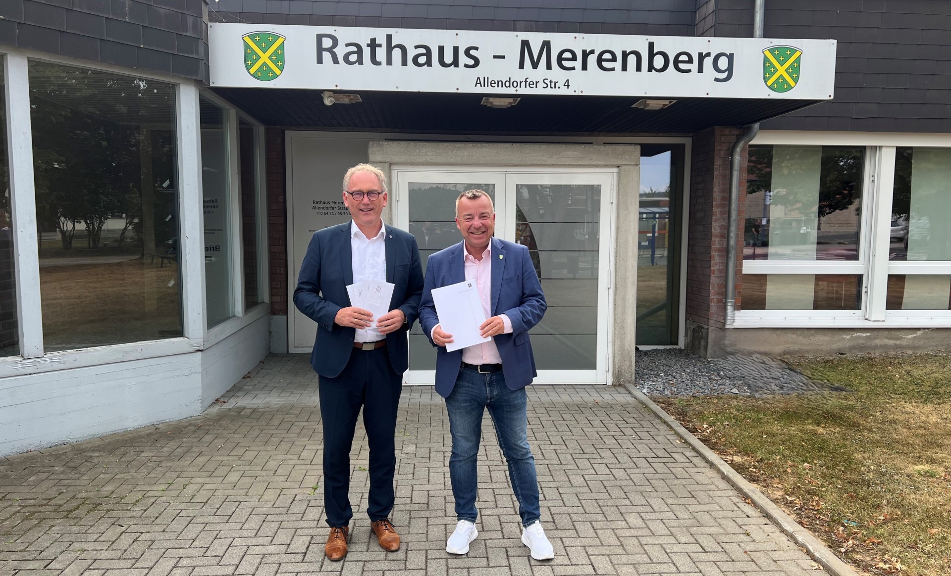 Der Pressedienst des Landkreises Limburg-Weilburg teilt mit, das Landrat Michael Köberle dem Merenberger Bürgermeiser Oliver Jung einen Förderbescheid aus der Säule E des Zukunftsfonds übergeben hat.
