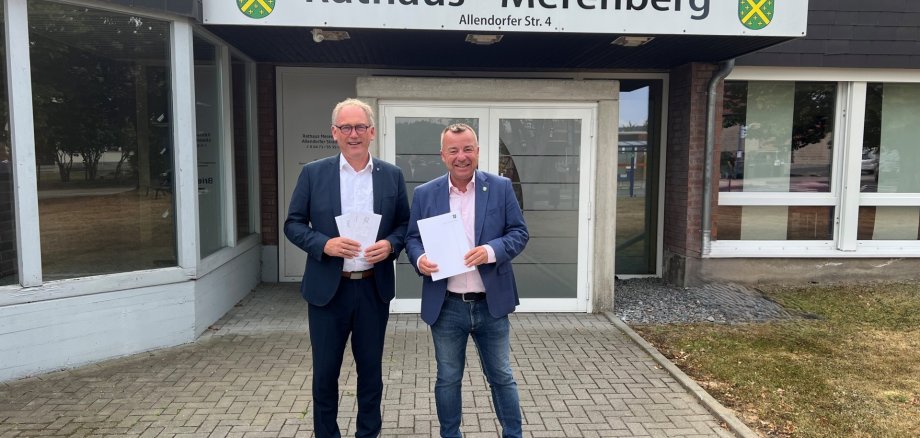 Der Pressedienst des Landkreises Limburg-Weilburg teilt mit, das Landrat Michael Köberle dem Merenberger Bürgermeiser Oliver Jung einen Förderbescheid aus der Säule E des Zukunftsfonds übergeben hat.